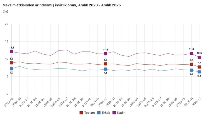TÜİK, Türkiye'nin aralık ayına ait işsizlik, istihdam, genç işsizliği gibi verileri detaylarıyla aktardı. Türkiye'de işsizlik oranı, Aralık 2025'te bir önceki aya göre 0,8 puan azalarak yüzde 7,7 oldu.