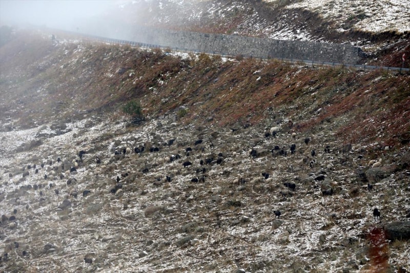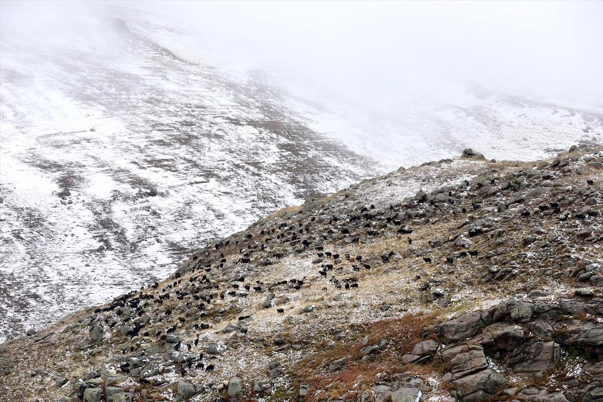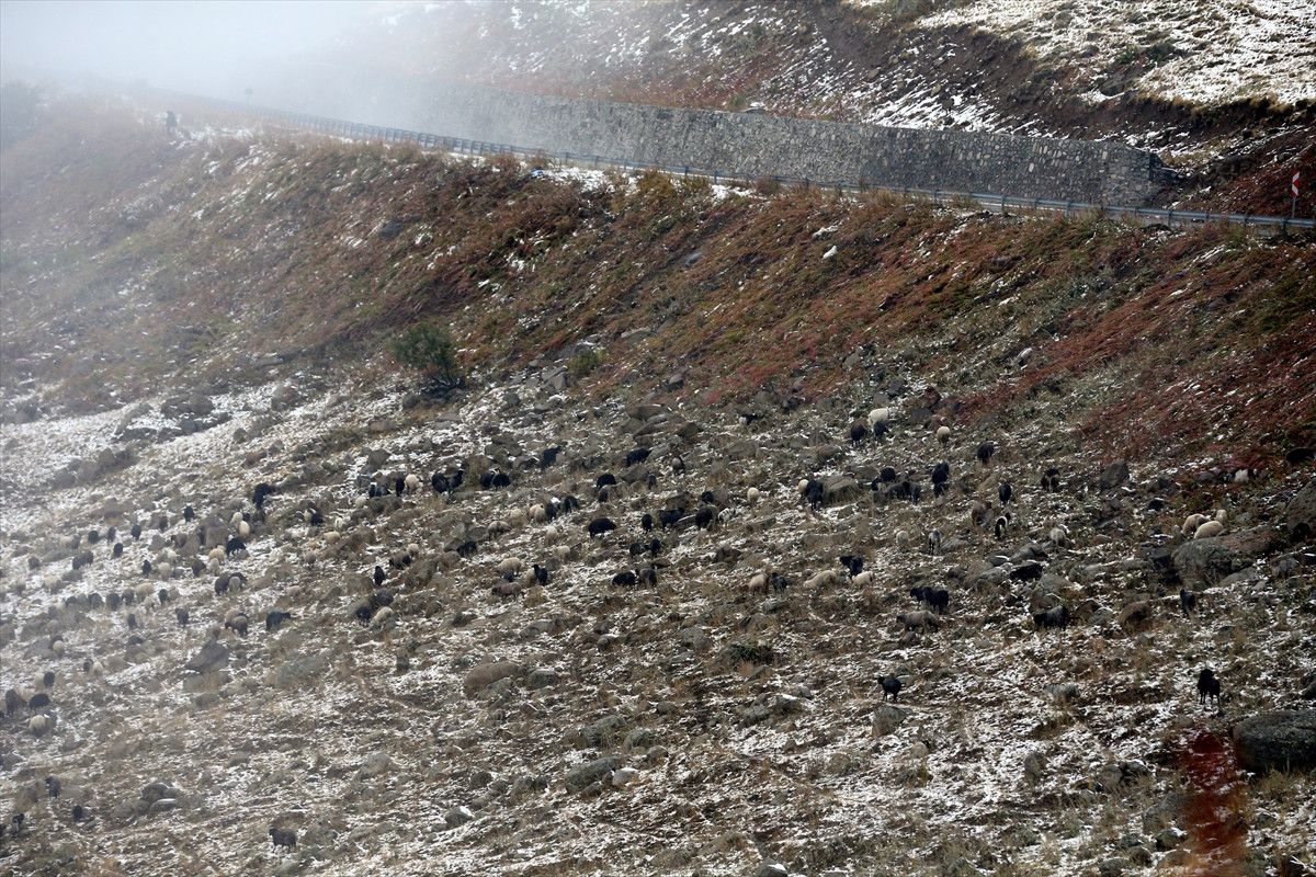 Bağdeşen köyü yaylasında da dönüşe geçen küçükbaş hayvan sürüsü, kar ve sisin etkili olduğu bölgede zorlandı.