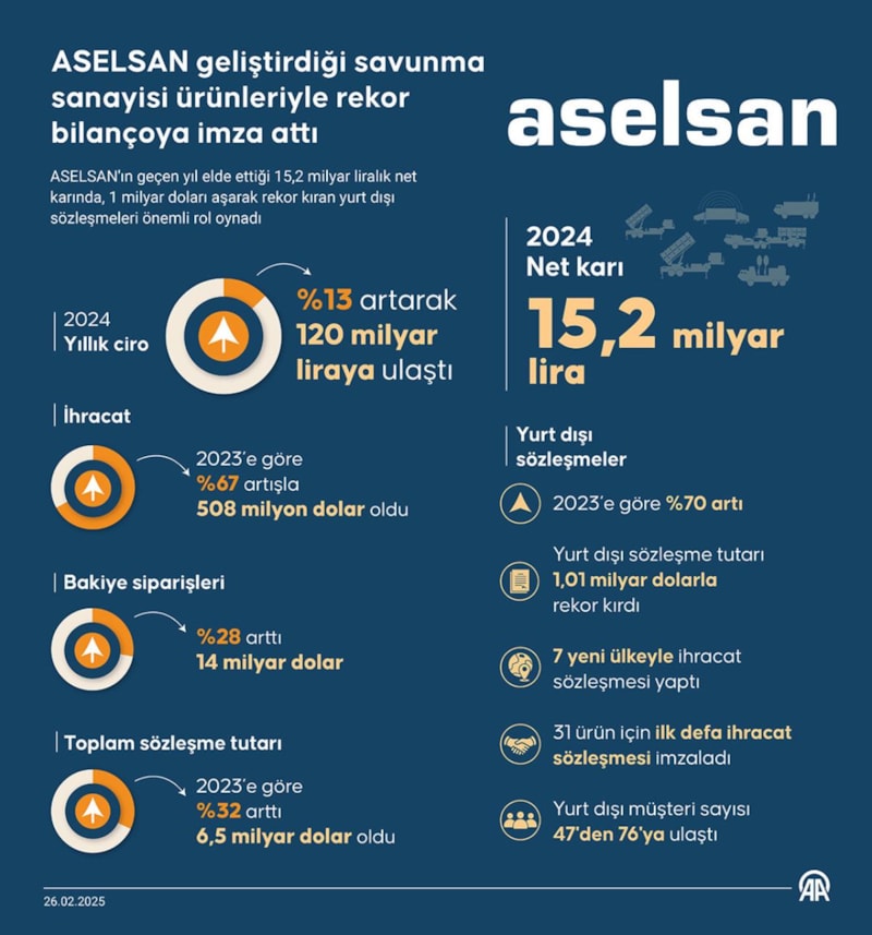ASELSAN, 2024'te dünyanın en hızlı büyüyen 10 savunma sanayi şirketinden biri oldu. Kurum; ürün ve müşteri sayısını, yaptığı sözleşmeleri, ihracatını, cirosunu ve kârını artırdığı 2024'te rekorlar kırdı.