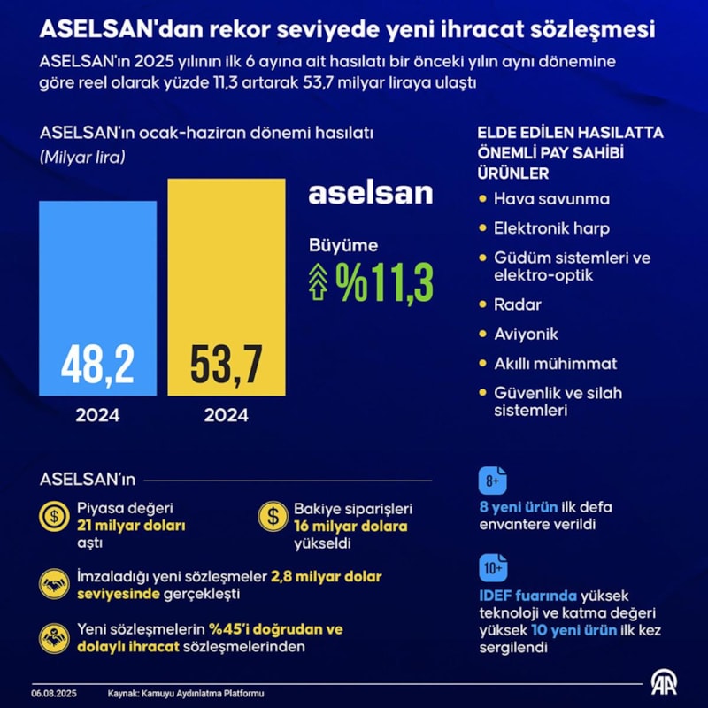 Cirosunu, bakiye sipariş tutarını, imzaladığı ihracat sözleşmelerini, karlılığını ve diğer birçok finansal göstergesini geliştiren ASELSAN, 2025 yılının ilk yarısını kuvvetli sonuçlarla geride bıraktı.