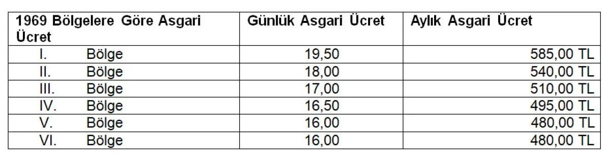 Asgari ücretin bölgesel olarak belirlendiği 1969 yılında tespit edilen ücretler şöyleydi: