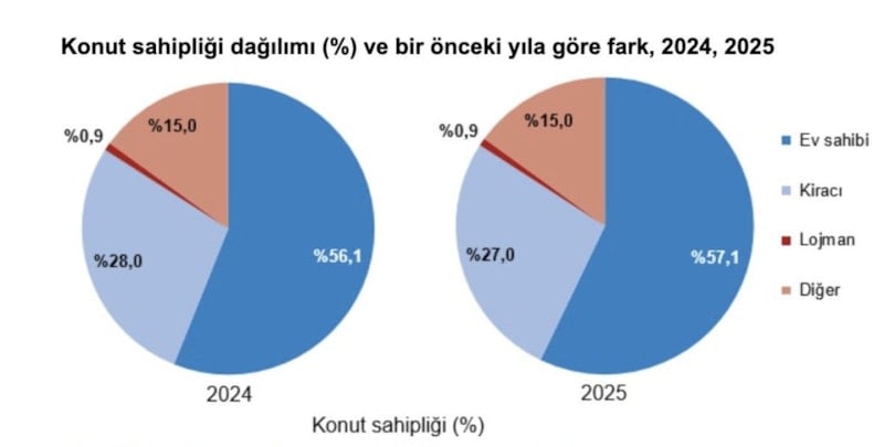 Türkiye’de oturulan konuta sahip olanların oranı, geçen yıla göre 1 puan artarak 2025 yılında yüzde 57,1’e çıktı.