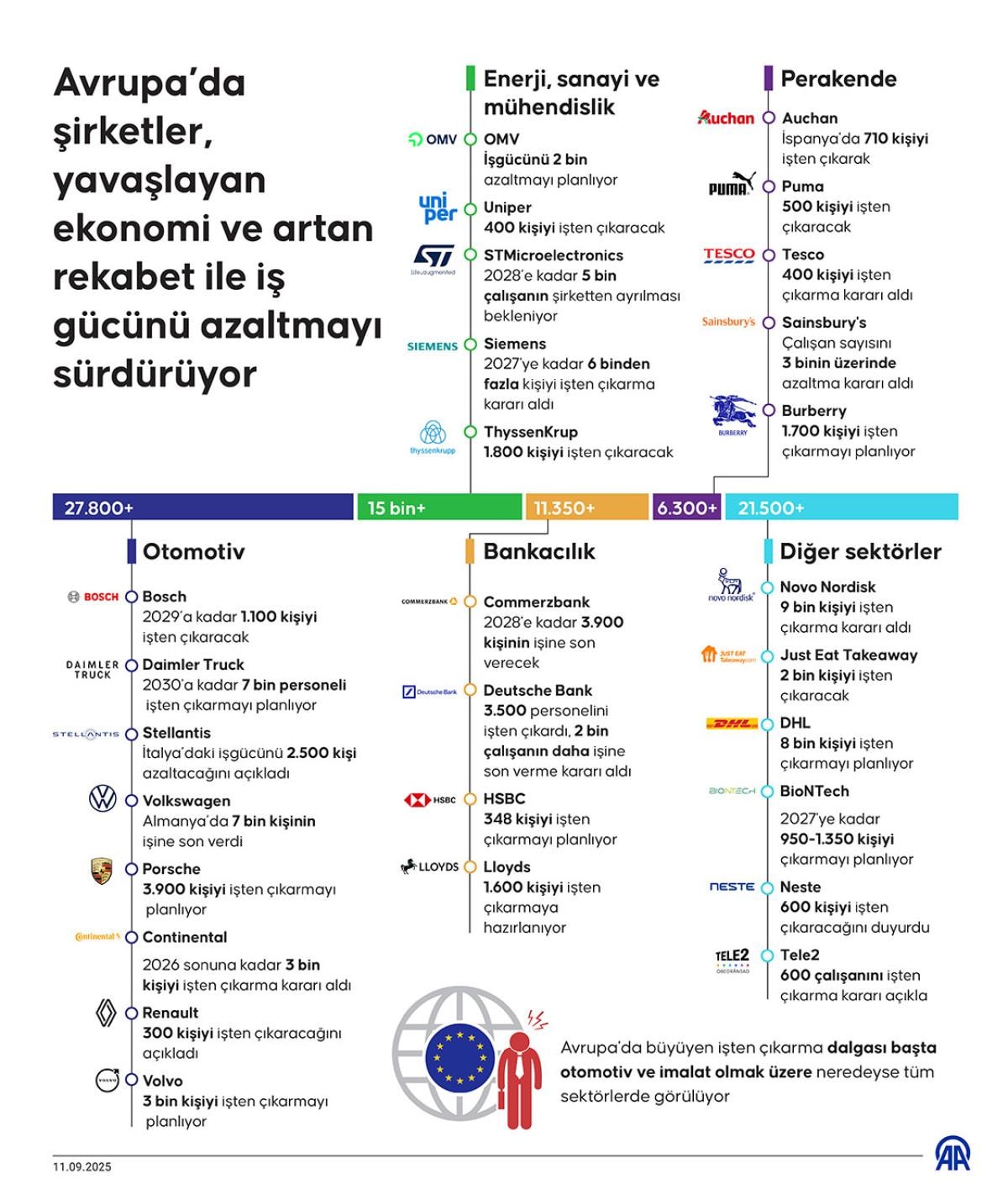 - Avrupa'daki işten çıkarma dalgası, zayıflayan ekonomi ve artan rekabet nedeniyle şirketlerin maliyetleri azaltma çabalarıyla hız kesmeden devam ediyor.