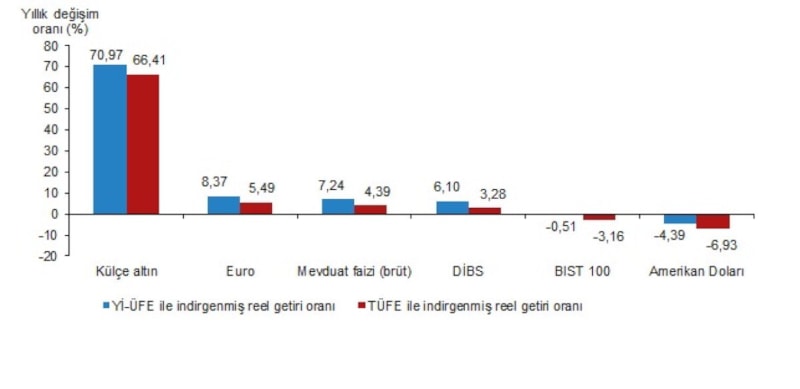 Finansal yatırım araçları yıllık olarak değerlendirildiğinde külçe altın; Yİ-ÜFE ile indirgendiğinde yüzde 70,97, TÜFE ile indirgendiğinde ise yüzde 66,41 oranlarında yatırımcısına en yüksek reel getiri sağlayan yatırım aracı oldu.