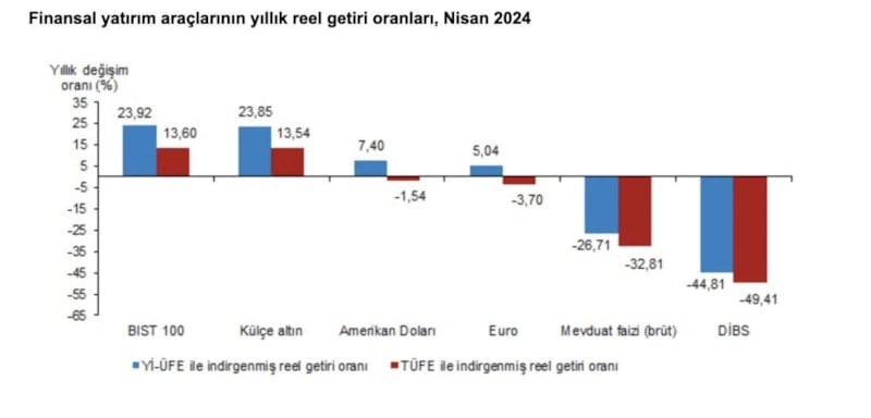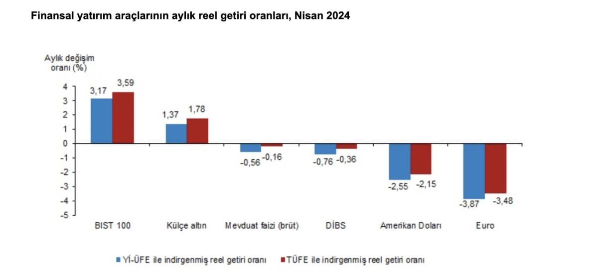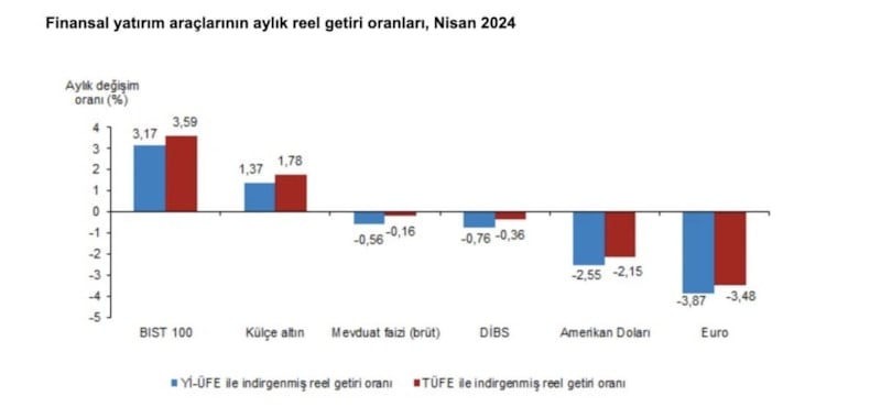 Türkiye İstatistik Kurumu (TÜİK), finansal yatırım araçlarının nisan ayı reel getiri oranlarını açıkladı.