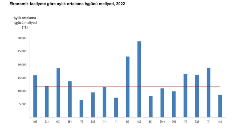 TÜİK'in açıkladığı İşgücü Maliyeti İstatistikleri sonuçlarına göre 2022 yılında aylık ortalama işgücü maliyeti 11 bin 602 TL olarak gerçekleşti. İş gücü maliyetinin en yüksek olduğu sektör finans ve sigorta faaliyetleri oldu.
