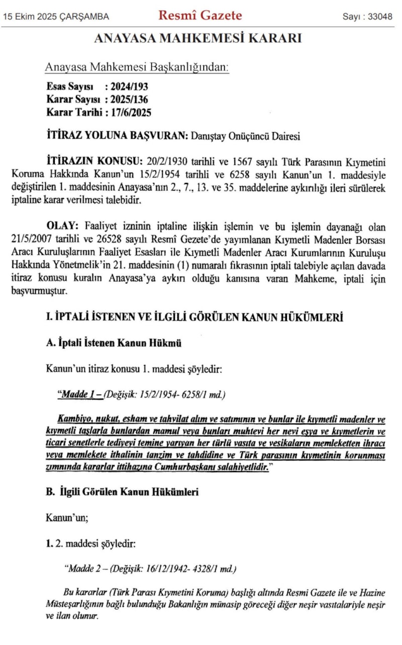 AYM'nin "Döviz, tahvil ve kıymetli maden düzenleme yetkisi Anayasa’ya aykırı" itirazı Anayasa’nın 35. maddesi “mülkiyet hakkı”, 13. madde “sınırlamalar”, 2 ve 7. maddeler de devletin hukuk devleti ilkesi, eşitlik ilkesi gibi temel düzenlemelerle ilgili gerçekleşti.