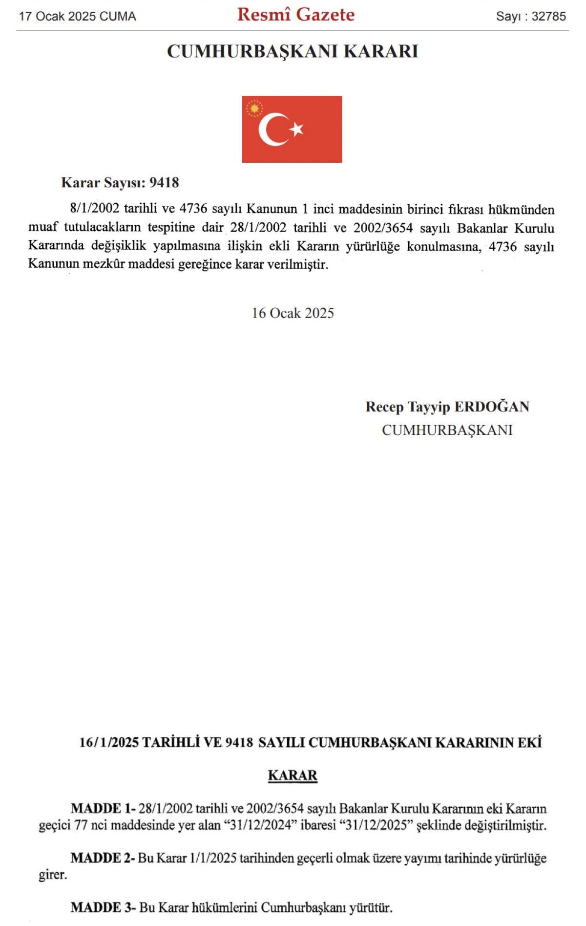 Bugün Resmi Gazete'de yayınlanan ilana göre 8/1/2002 Tarihli ve 4736 Sayılı Kanunun 1 inci Maddesinin Birinci Fıkrası Hükmünden Muaf Tutulacakların Tespitine Dair 28/1/2002 Tarihli ve 2002/3654 Sayılı Bakanlar Kurulu Kararında Değişiklik Yapılması Hakkında Karar verildi.