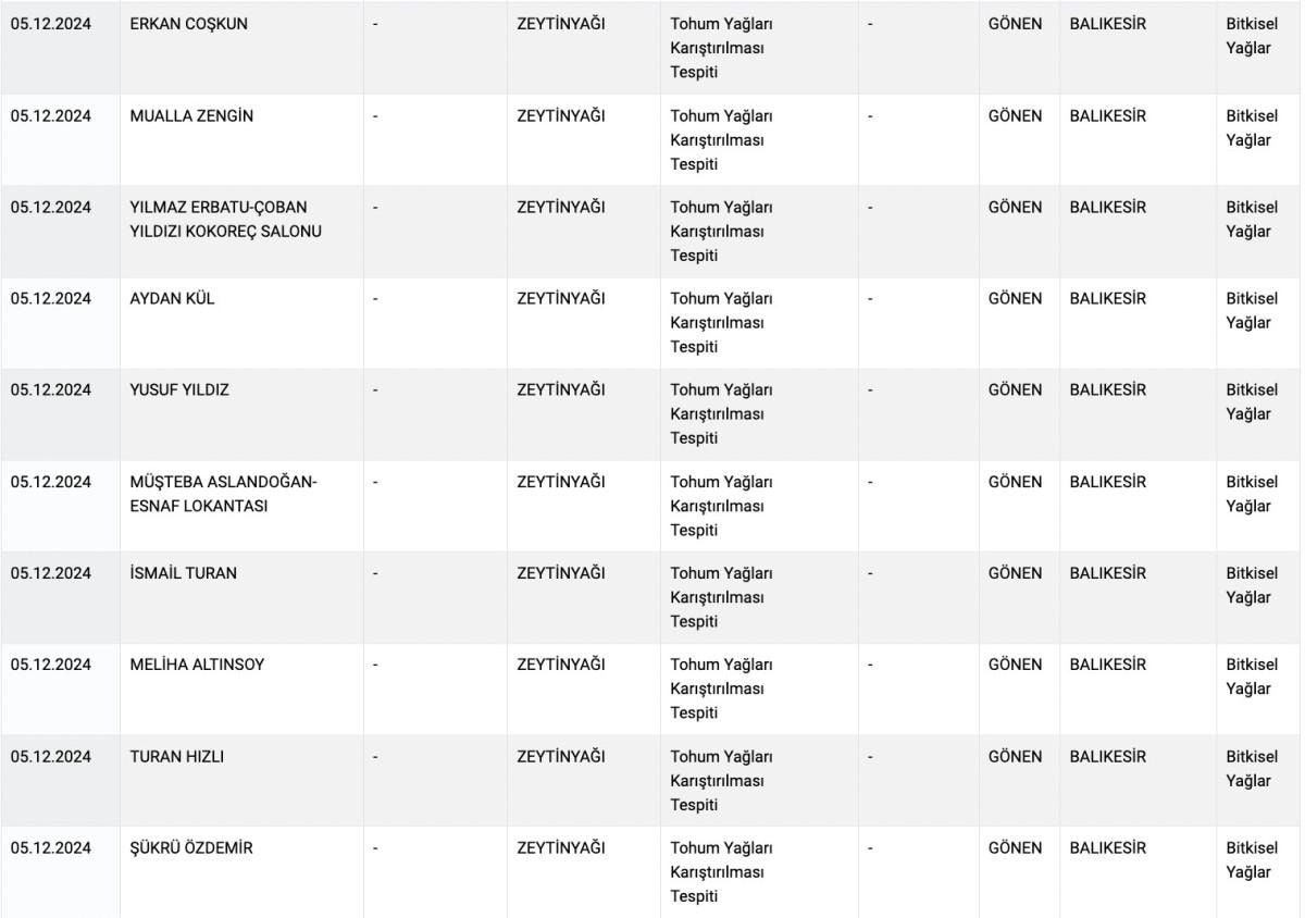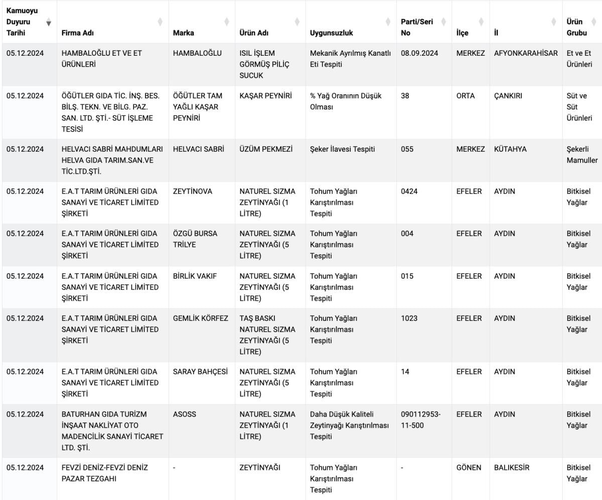 Listede bulunan ürünlerde, kanatlı eti, sakatat ve tek tırnaklı tespiti ile taklit, tağşiş ve bitkisel yağ tespiti gibi birçok uygunsuzluk yer alıyor.