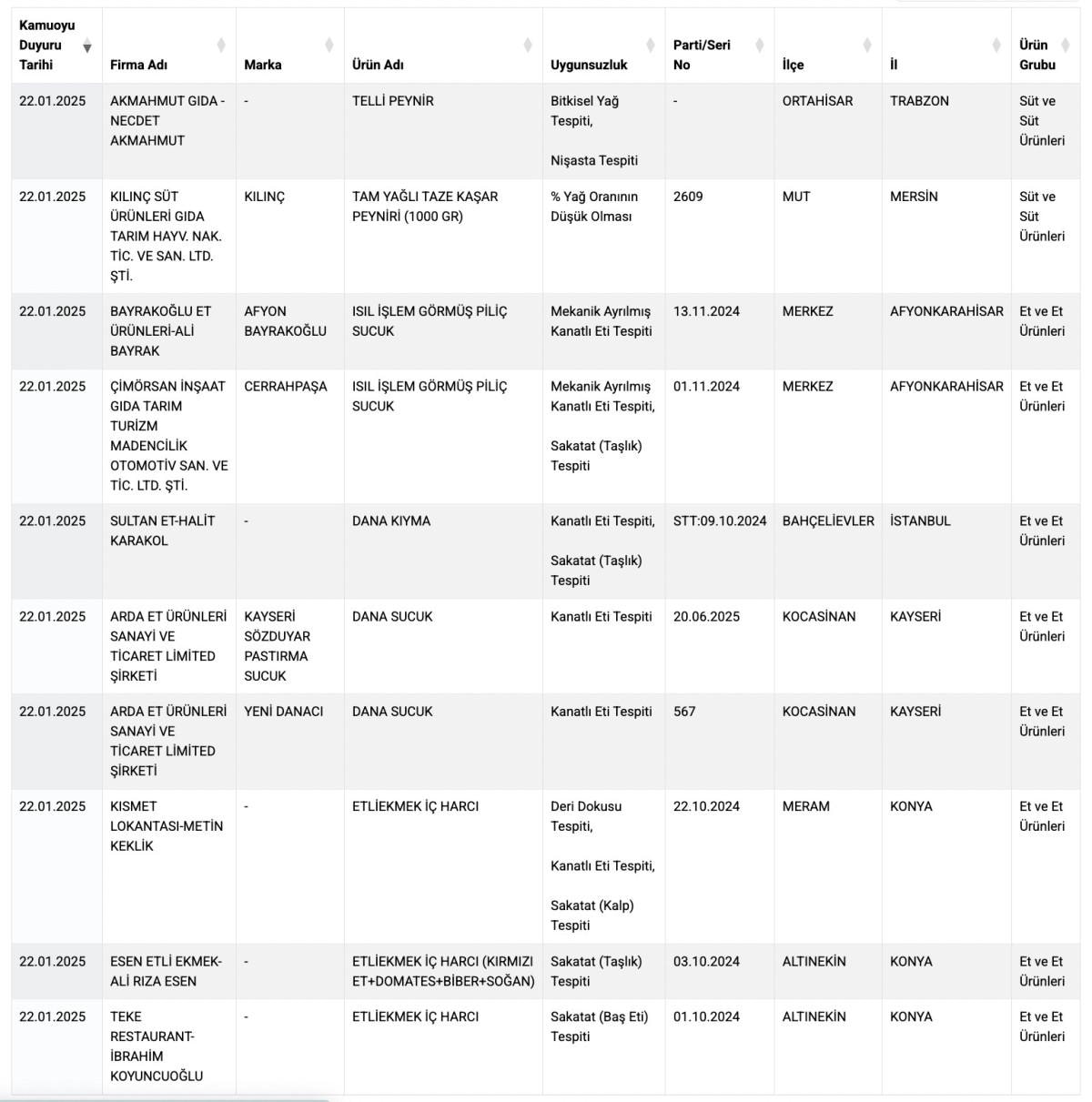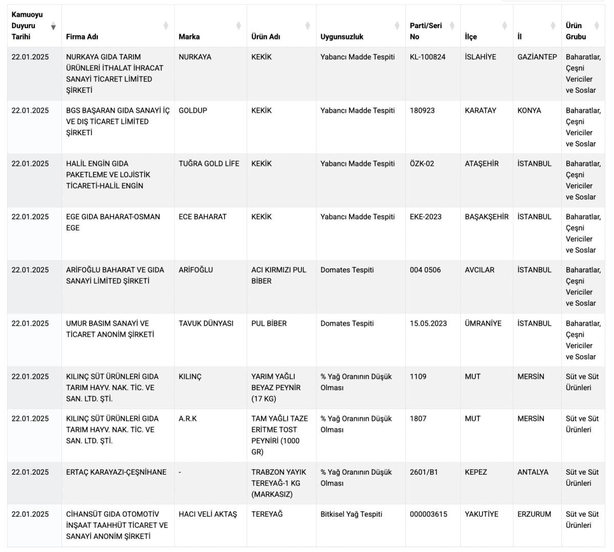 Taklit veya tağşiş yapılan gıdalar listesine ise 41 ürün eklendi ve buradaki ürün sayısı da 950 oldu.
