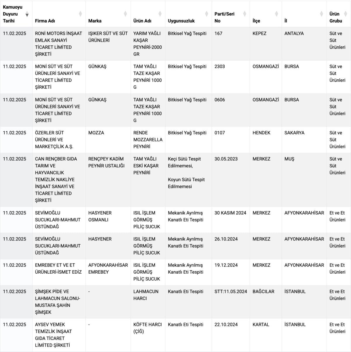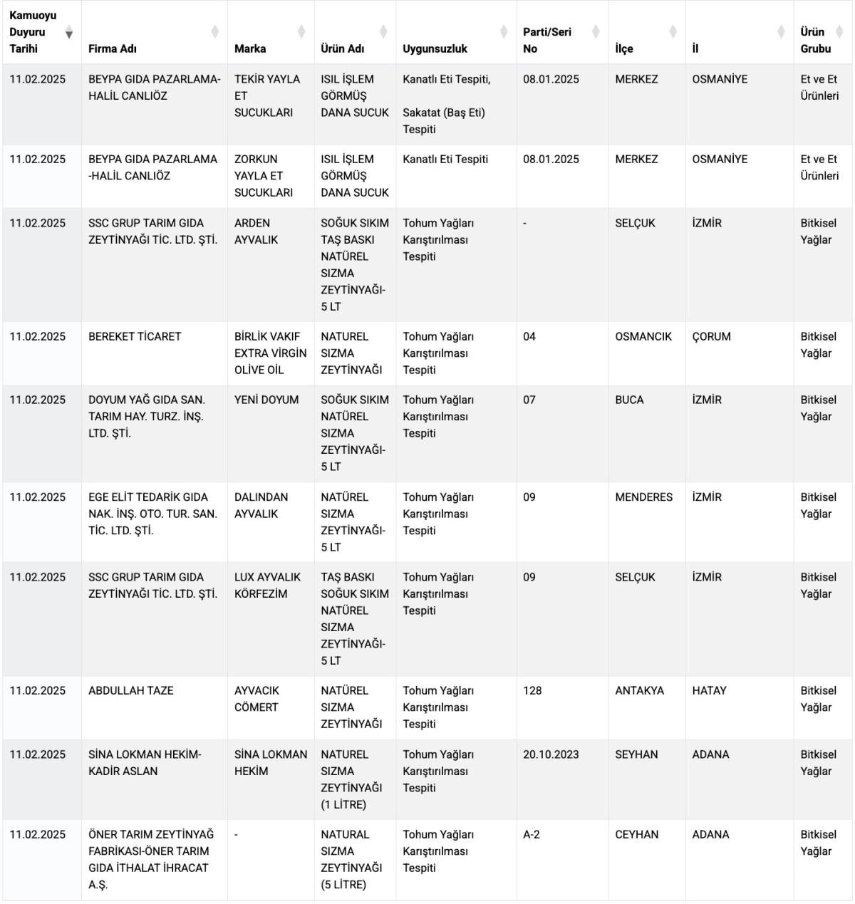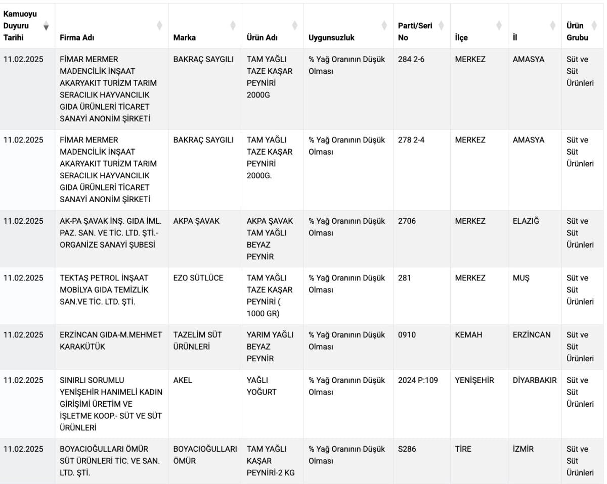 Taklit veya Tağşiş Yapılan Gıdalar listesine ise yeni 25 ürün katıldı ve buradaki ürün sayısı da böylece 956'ya çıktı.