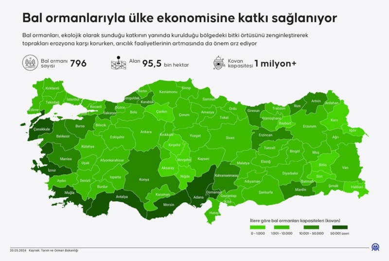 Geçen yıl sonu itibarıyla 95 bin 459 hektar ormanlık alanda kurulan 794 bal ormanıyla yaklaşık 1 milyon kovana ev sahipliği yapılabilecek imkan oluşturularak ülke ekonomisine de dolaylı katkı sağlanıyor.