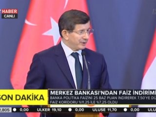 Konuşmasının ardından gazetecilerin sorularını yanıtlayan Başbakan Davutoğlu, Merkez Bankası'nın faiz kararına ilişkin soruya şöyle cevap verdi; ""Merkez Bankası'nın faiz indirimi haberi bize ulaştı. Faizlerin inme trendinde olması önemlidir. Türk ekonomisinin sıhattik göstergelerinden biridir. Daha fazla bir ivmeyle olması yönündeki beklentimizi hep ifade ettik.