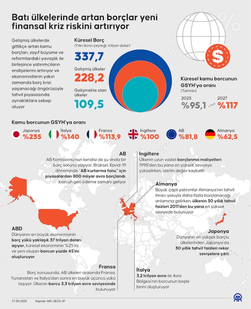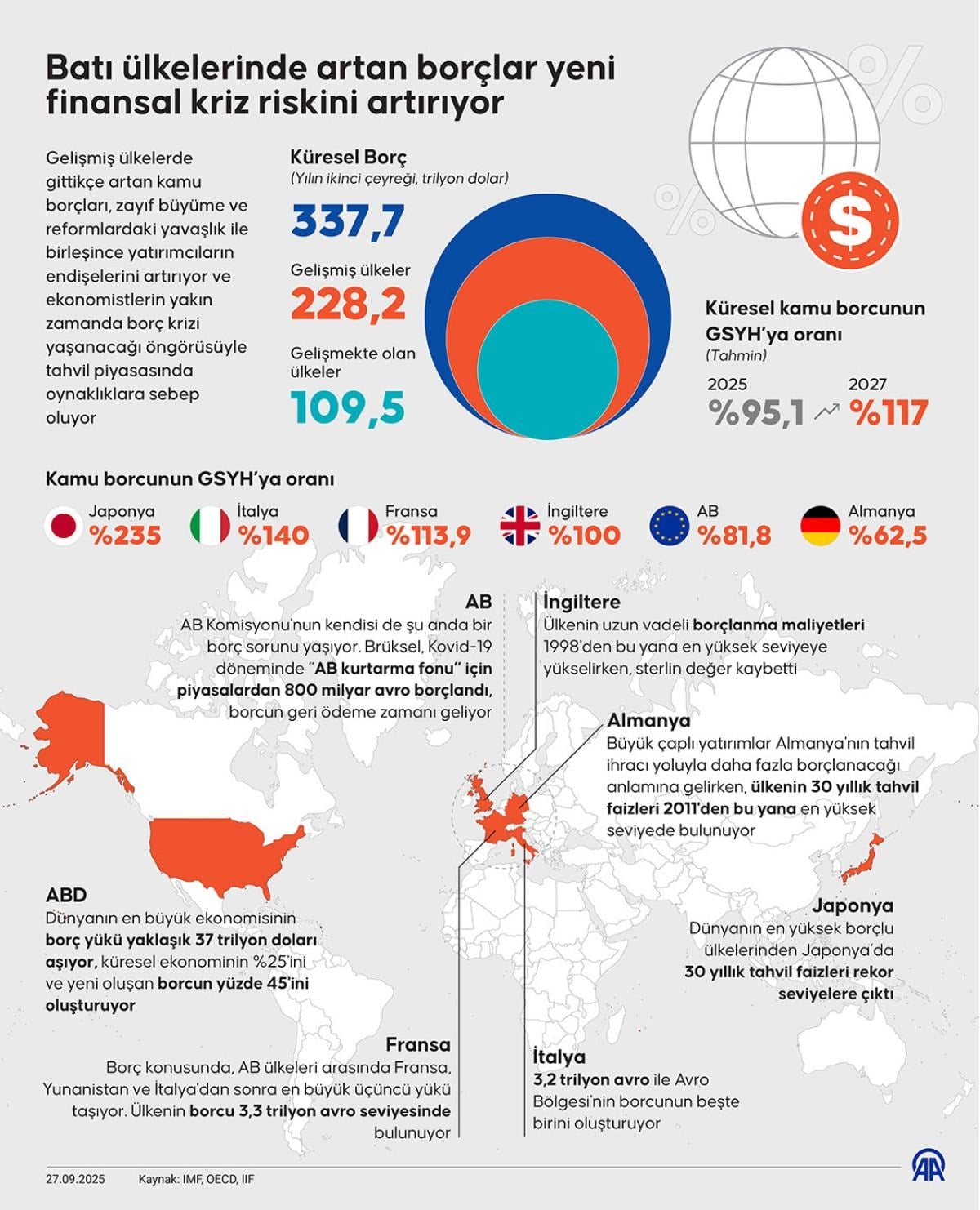 Analizde, Fransa, İngiltere ve ABD gibi büyük ekonomilerin küresel kamu borcundaki artışın başlıca nedenleri arasında gösterildiğine dikkati çekilirken, birçok ülkede brüt finansman ihtiyaçlarının da yüksek seviyelerde kalmasının beklendiği vurgulanıyor.