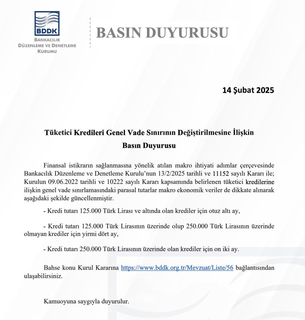 Finansal istikrarın sağlanmasına yönelik atılan makro ihtiyati adımlar çerçevesinde Bankacılık Düzenleme ve Denetleme Kurulu’nun 13/2/2025 tarihli ve 11152 sayılı Kararı ile; Kurulun 09 Haziran 2022 tarihli ve 10222 sayılı Kararı kapsamında belirlenen tüketici kredilerine ilişkin genel vade sınırlamasındaki parasal tutarlar makro ekonomik veriler de dikkate alınarak aşağıdaki şekilde güncellenmiştir.
