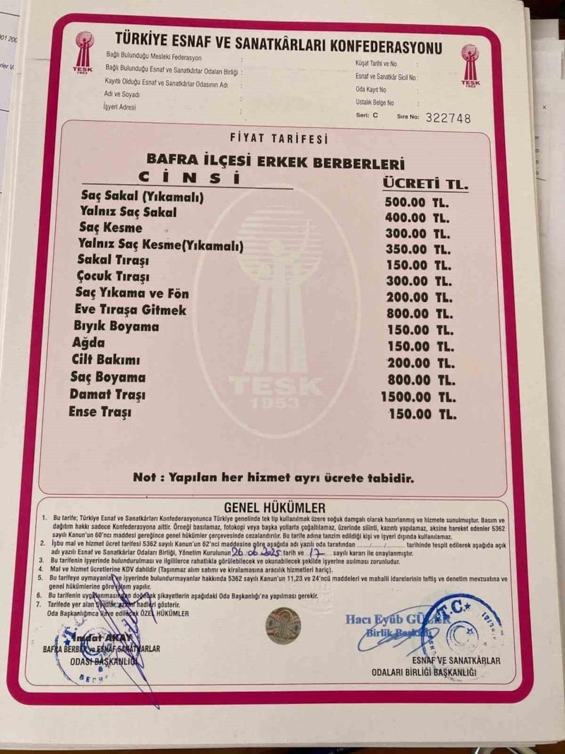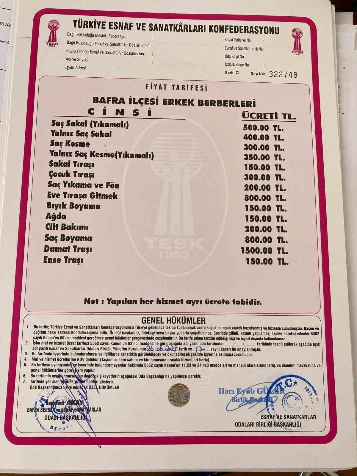 Bafra Berberler Odası, artan maliyetleri gerekçe göstererek yeni fiyatları duyurdu.