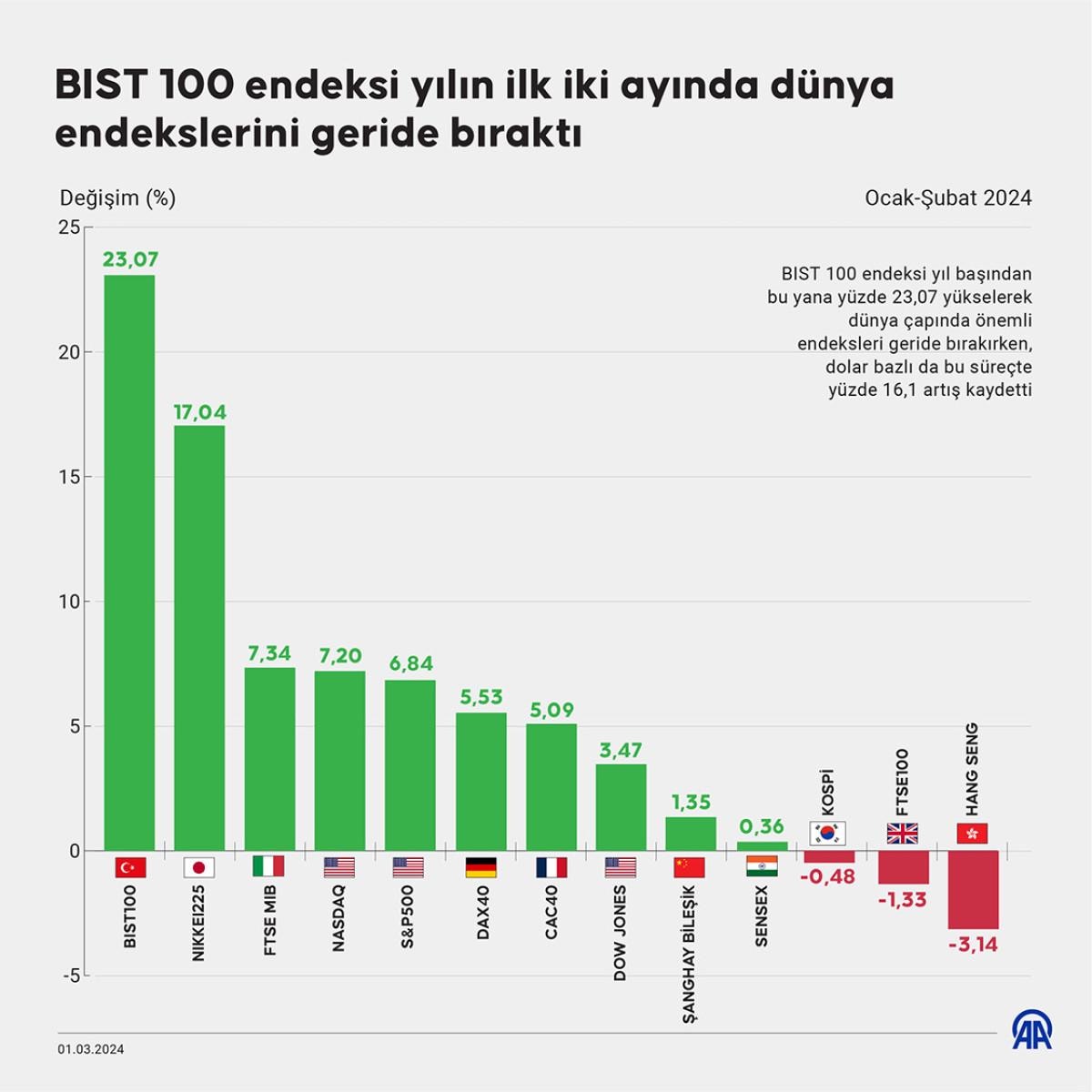 BIST 100 endeksi, 2024'ün başından bu yana yüzde 23,07 değer kazancıyla küresel pay piyasalarını geride bıraktı.