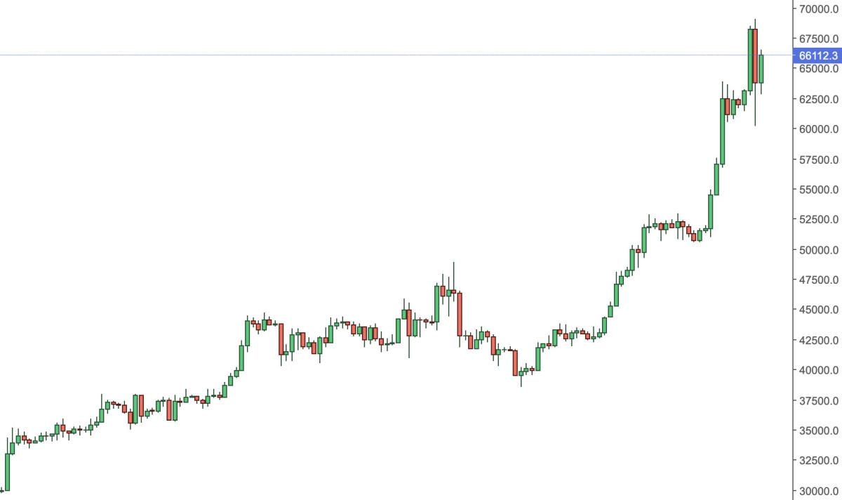 Kasım 2021’de 69 bin dolar seviyesini test eden Bitcoin, dün TSİ 18.10 itibarıyla 69 bin 170 dolardan işlem görerek tarihinin en yüksek seviyesine çıktı.