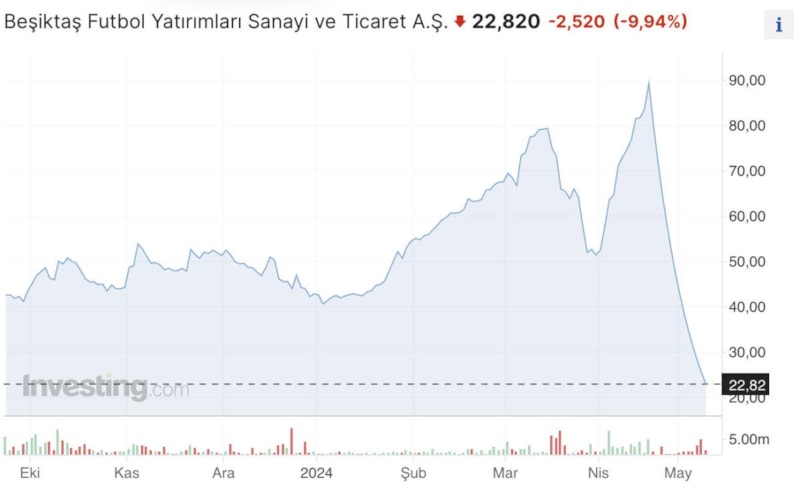 Beşiktaş'ın hisseleri, 89,75 lira ile zirveyi gördükten sonra 22,82 liraya kadar gerileme gösterdi.