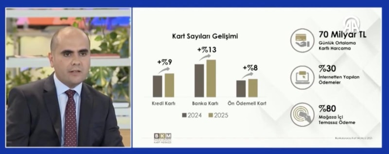 Ozan Deniz, Türkiye'deki toplam kredi kartı sayısının 137 milyona, banka kartlarının 215 milyona, ön ödemeli kartların ise 105 milyona ulaştığını belirterek, temmuzda günlük 70 milyar liralık, aylık ise 2,16 trilyon liralık kartlı işlem gerçekleştirildiğini söyledi.