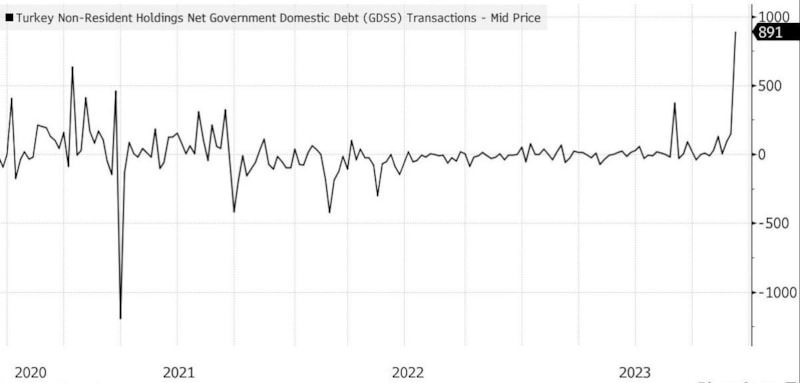 Uluslararası yatırımcılar, geçen hafta net 891 milyon dolarlık lira cinsinden tahvil aldı. Hisse senetlerine giriş, 2020'den beri en yüksek seviyeyi gördü.