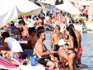 Gümbet plajında adım atacak yer kalmazken, karada yer kalmayınca, beach club ve otel yöneticilerinin denizin içine masa sandalye ve şezlong koyarak konuklarını serinletme yolunu seçtikleri görüldü.
