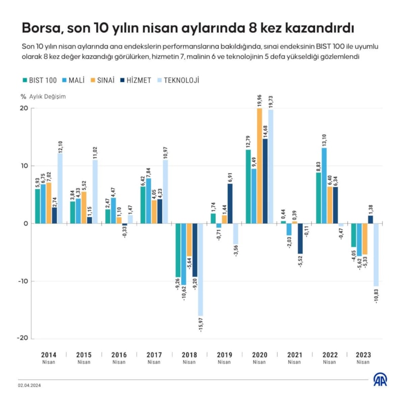 Son 10 yılın nisan aylarında ana endekslerin performanslarına bakıldığında, sınai endeksinin BIST 100 ile uyumlu olarak 8 kez değer kazandığı görülürken hizmetin 7, malinin 6 ve teknolojinin 5 defa yükseldiği gözlemlendi.
