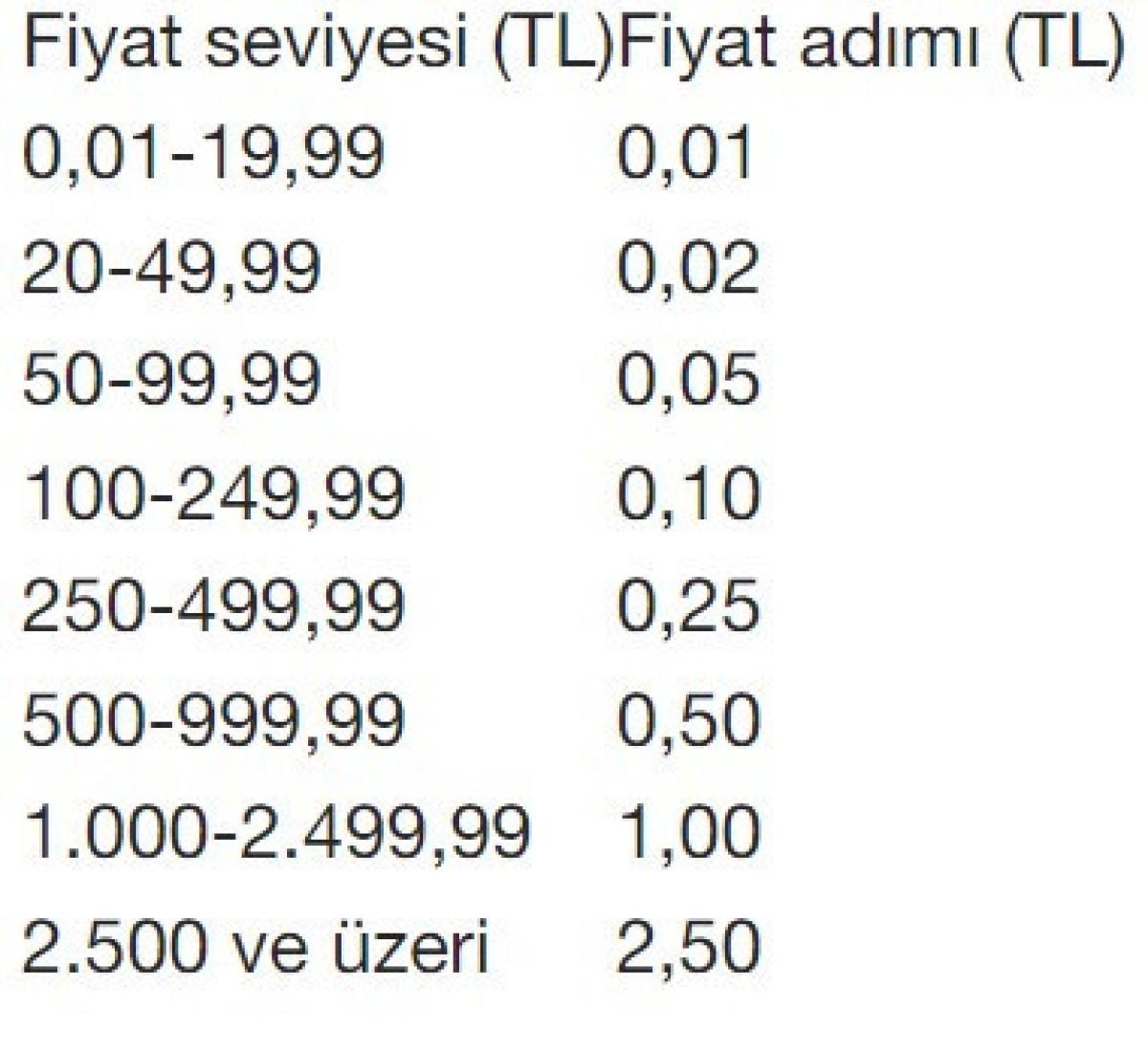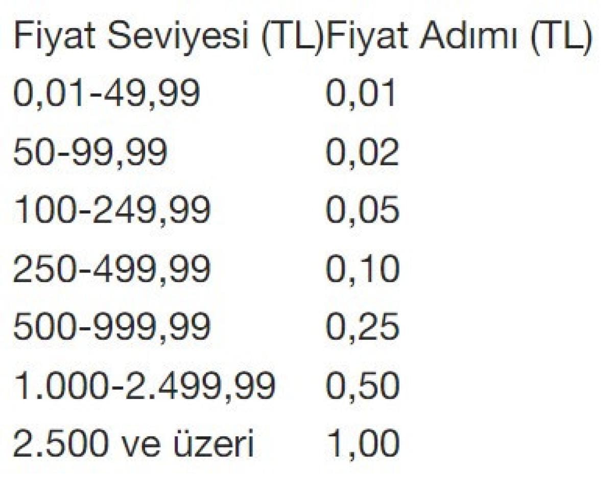 Paylar, yeni pay alma hakları, gayrimenkul sertifikaları, sahipliğe dayalı kira sertifikaları, borsa yatırım fonları, gayrimenkul yatırım fonları ve girişim sermayesi yatırım fonları işlem sıralarında geçerli olan fiyat adımı uygulaması tablolarda yer aldığı şekilde yeniden düzenlenmiştir.