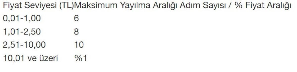 Söz konusu sermaye piyasası araçlarında gerçekleştirilen piyasa yapıcılık faaliyeti çerçevesinde geçerli olan maksimum kotasyon yayılma aralıkları tabloda yer aldığı şekilde değiştirilmiştir.