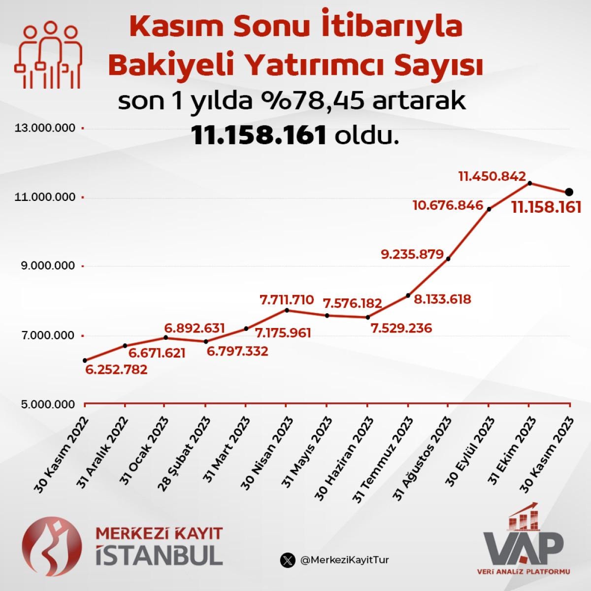 Kasım sonu kapanış verileri itibarıyla bakiyeli yatırımcı sayısı ise son 1 yılda yüzde 78,45 artarak 11 milyon 158 bin 161'e ulaştı.