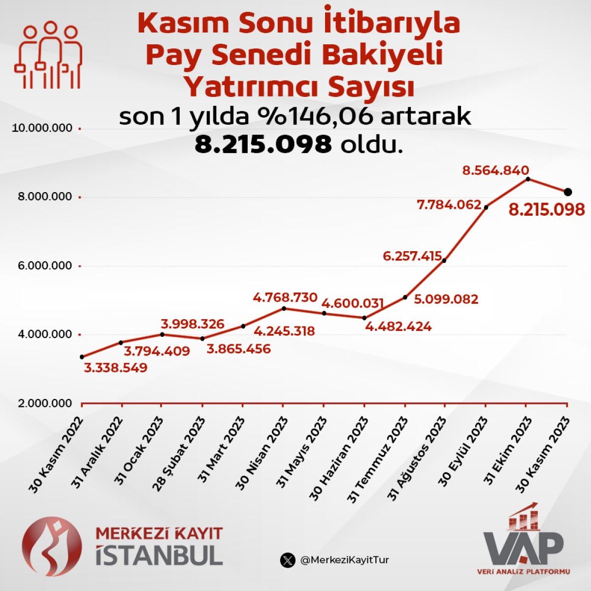 Açıklanan verileri göre, kasım sonu kapanış verileri itibarıyla pay senedi bakiyeli yatırımcı sayısı son 1 yılda yüzde 146,06 artarak 8 milyon 215 bin 98 oldu.