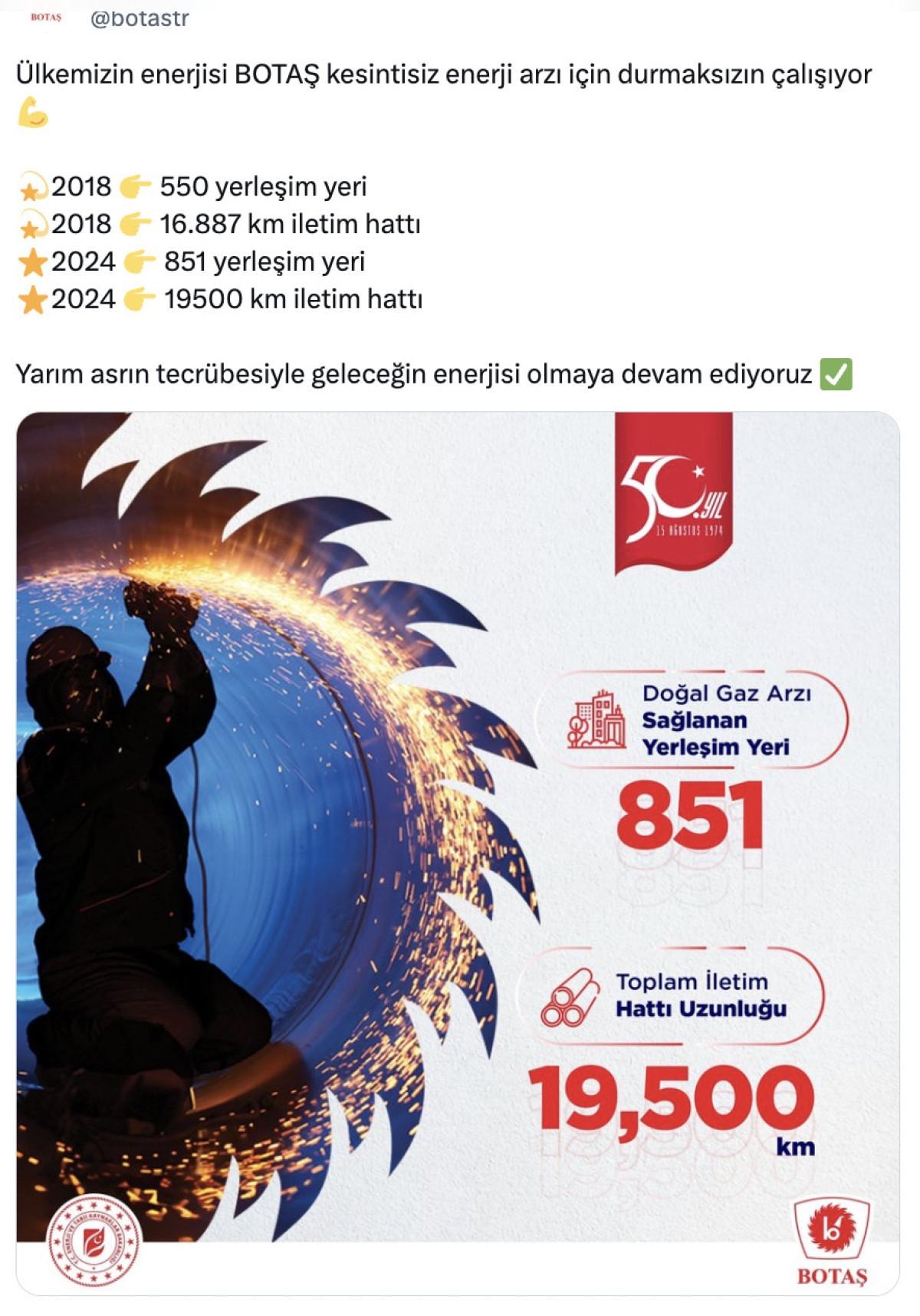 Boru Hatları ile Petrol Taşıma AŞ (BOTAŞ), sosyal medya hesabı üzerinden yayınladığı mesajıyla, 2024’e kadar 851 yerleşim yerinde 19 bin 500 kilometre iletim hattı kurulduğunu açıkladı.