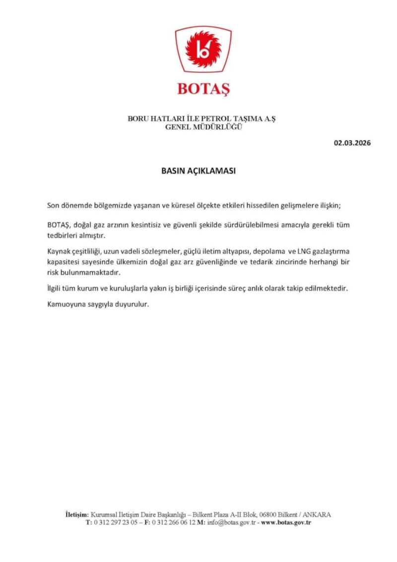 Boru Hatları İle Petrol Taşıma Anonim Şirketi (BOTAŞ), ABD-İsrail ile İran arasında yaşanan saldırıların küresel etkilerine ilişkin açıklama yaparak, doğal gaz arzının kesintisiz ve güvenli şekilde sürdürülebilmesi amacıyla gerekli tüm tedbirlerin alındığını bildirdi.