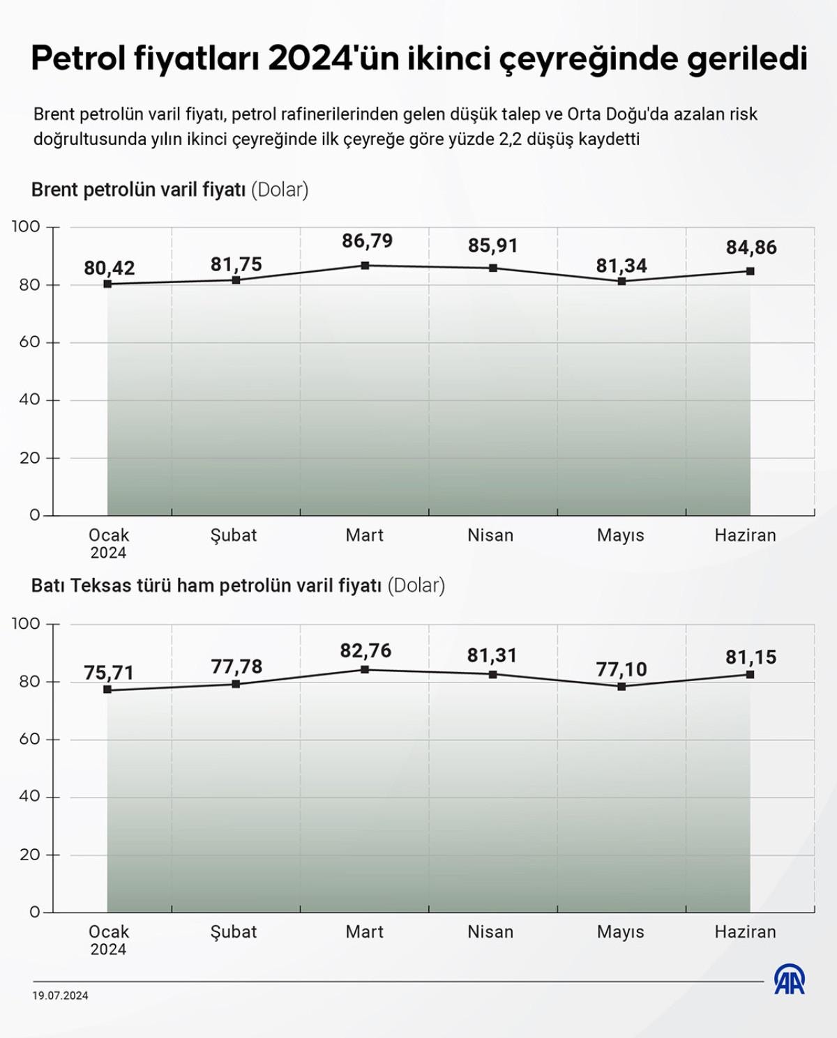 Böylece Brent petrolün varili, yılın ikinci çeyreğinde yüzde 2,2 değer kaybetti. Batı Teksas türü ham petrolün varil fiyatı ise ikinci çeyrekte yüzde 1,9 düştü.