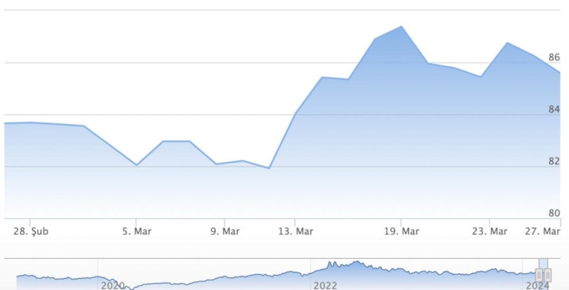 Brent petrolün varil fiyatı, bugün itibarıyla kapanışa göre yüzde 0,90 düşüşle 84,70 dolardan işlem görüyor.