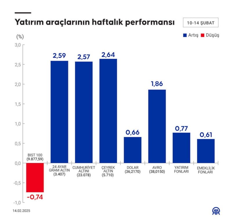 Bu hafta yatırım araçlarının performansı açıklandı. Bu hafta Borsa İstanbul'da işlem gören hisse senetleri haftalık bazda ortalama yüzde 0,74 azalırken, altının gram fiyatı yüzde 2,59, dolar/TL yüzde 0,66 ve euro/TL yüzde 1,86 artış kaydetti.