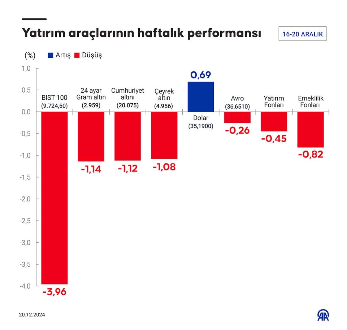 Borsa İstanbul'da işlem gören hisse senetleri haftalık bazda ortalama yüzde 3,96, altının gram fiyatı yüzde 1,14, euro/TL yüzde 0,26 azalırken, dolar/TL yüzde 0,69, arttı.