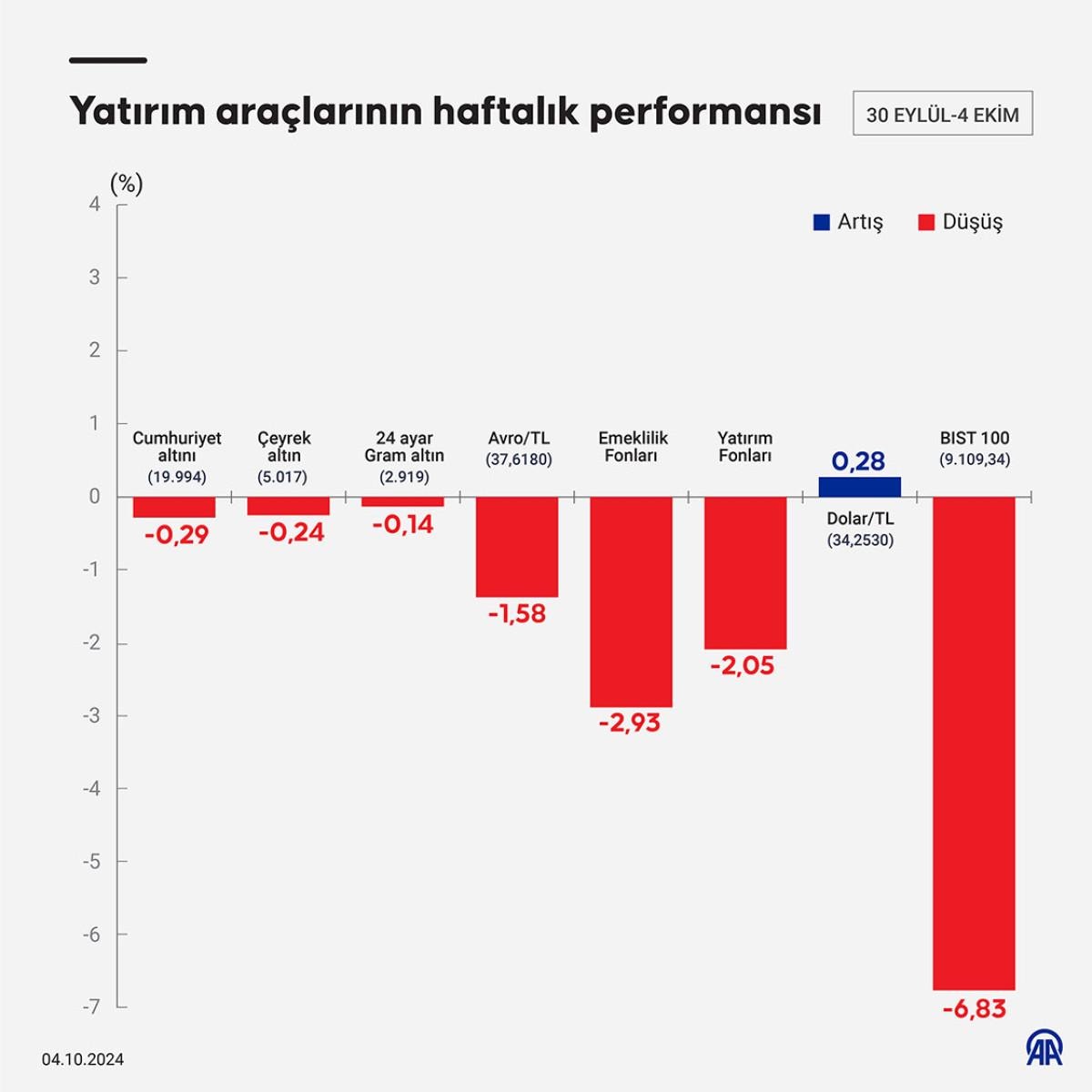 Borsa İstanbul'da işlem gören hisse senetleri haftalık bazda ortalama yüzde 6,83, euro/TL yüzde 1,58 ve altının gram fiyatı yüzde 0,14 azalış kaydederken, dolar/TL yüzde 0,28 artış gösterdi.