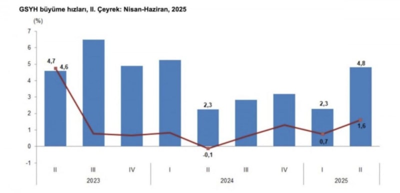 Türkiye, 2025 yılının ikinci çeyreğinde yüzde 4,8 büyüme oranına ulaşırken, dünya ülkeleri arasında ise zirvede yer aldı. OECD ülkelerinin ortalama büyüme oranları yüzde 1,7 olurken, Avrupa Birliği ülkelerinin ortalaması yüzde 1,5 seviyelerinde oldu.