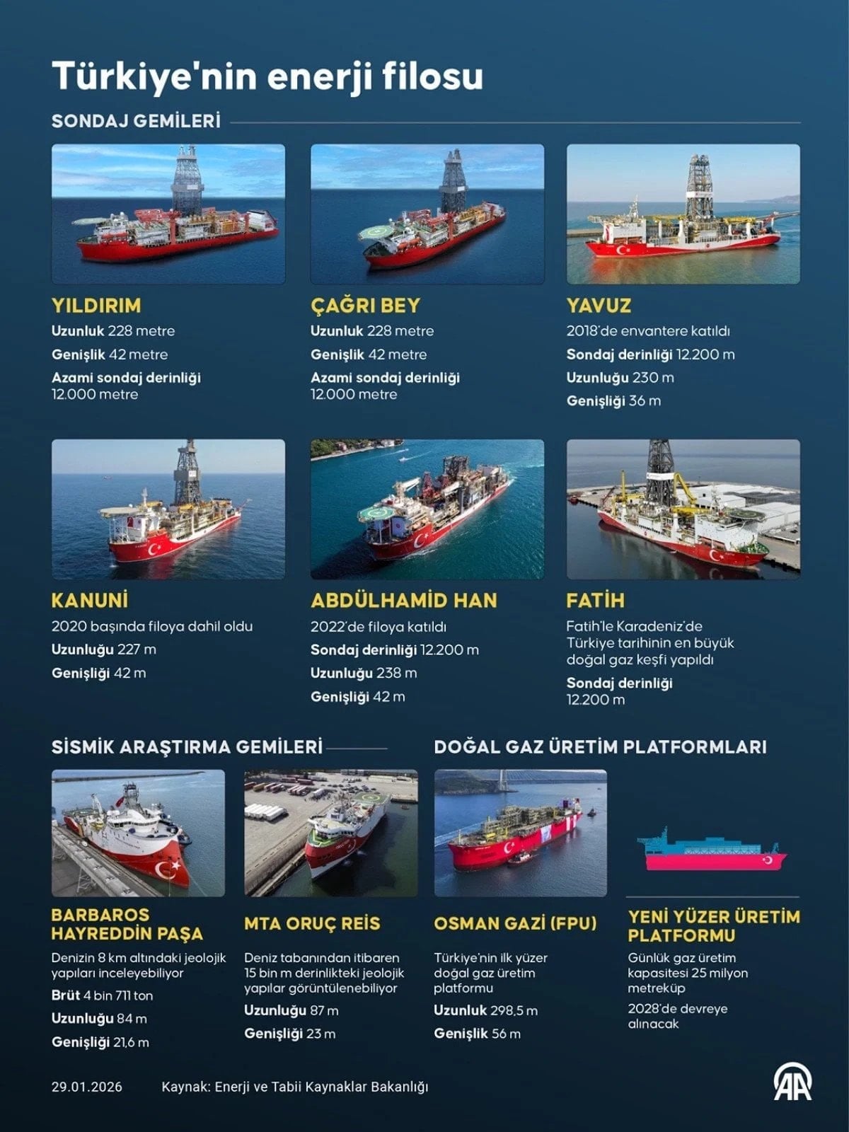 Deniz sahalarında üretimi artırmak ve yeni operasyonlarda kullanmak için 2025'te enerji filosuna iki yeni gemi eklediklerini anlatan Bayraktar, "7. nesil ultra derin deniz sondaj gemisi olarak nitelenen gemilerimizin uzunluğu 228, genişliği 42, yüksekliği 114 metredir. Bu gemilerimizle 12 bin metre derinliğe kadar sondaj yapabiliyoruz." dedi.