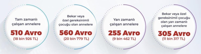 "Tam zamanlı çalışan annelere 510 euro, bekar veya özel gereksinimli çocuğu olan annelere 560 euro, yarı zamanlı çalışan annelere 255 euro, bekar veya özel gereksinimli çocuğu olan yarı zamanlı çalışan annelere 305 euro."