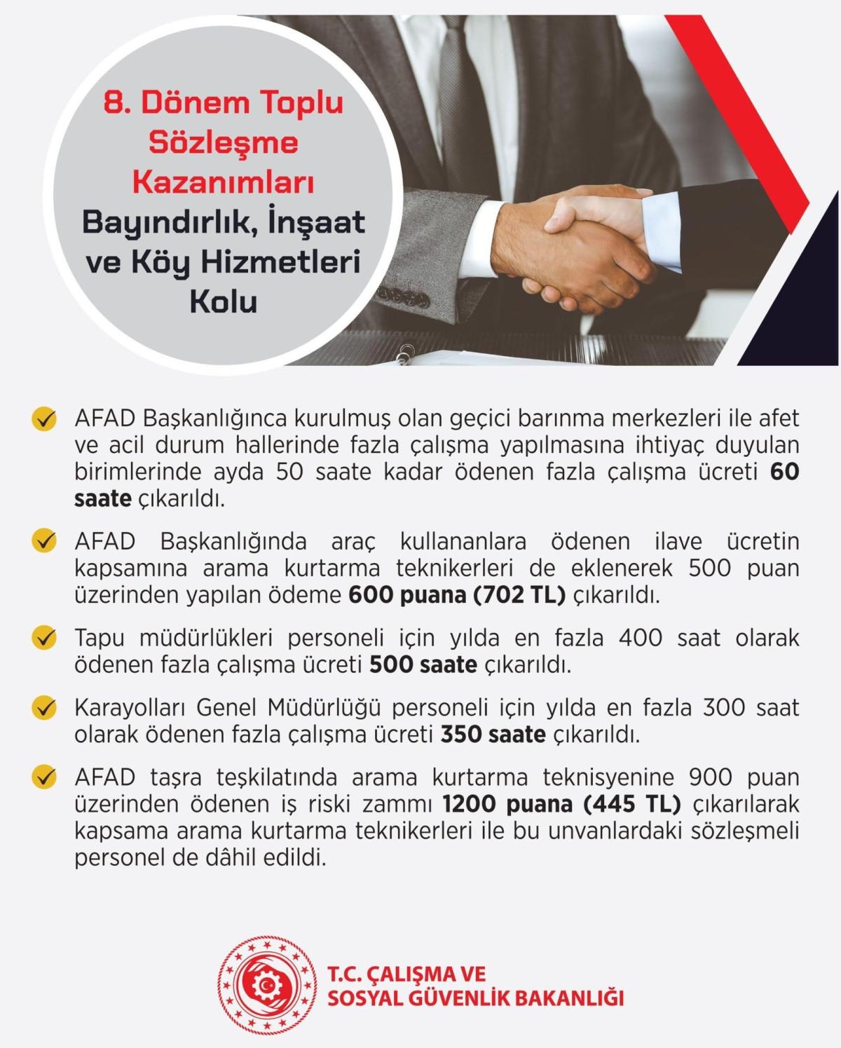 Çalışma ve Sosyal Güvenlik Bakanlığı, 8. Dönem Toplu Sözleşme Kazanımlarını aktarırken, "Bayındırlık, İnşaat ve Köy Hizmetleri Kolu’nda Anlaşmaya Varılan Kazanımlarla İnsanı merkeze alan hizmet anlayışımız ve çözüm odaklı politikalarımızla kamu görevlilerimizin yanında olduk." dedi.