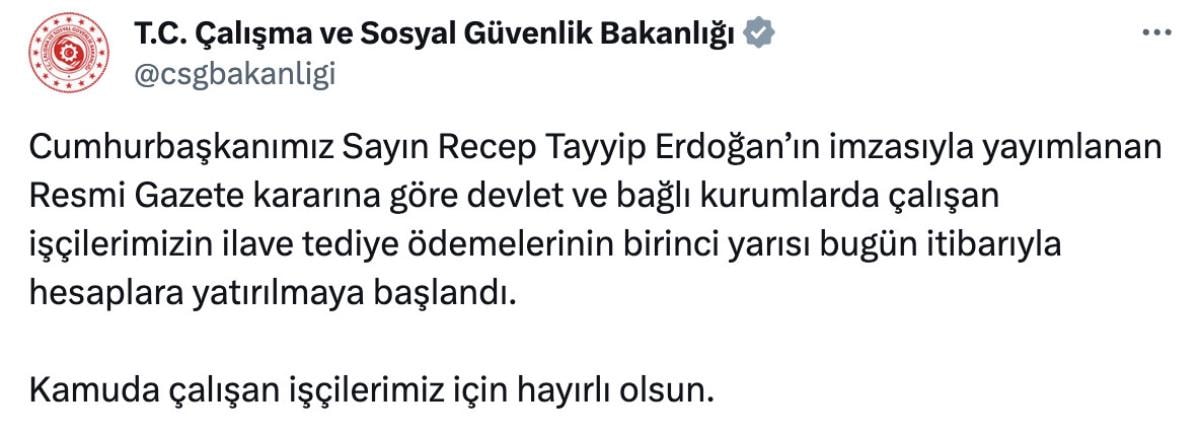 Resmi Gazete'de yayınlanan bir kararla birlikte, devlet ve bağlı kurumlarda çalışan işçilerin ilave tediye ödemelerinin birinci yarısının, bugün itibarıyla hesaplara yatırılmaya başlandığı bilgisi verildi.