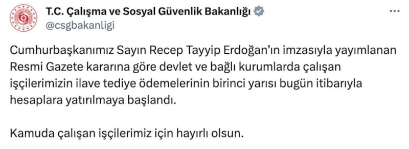 Cumhurbaşkanımız Sayın Recep Tayyip Erdoğan’ın imzasıyla yayınlanan Resmi Gazete kararına göre devlet ve bağlı kurumlarda çalışan işçilerimizin ilave tediye ödemelerinin birinci yarısı bugün itibarıyla hesaplara yatırılmaya başlandı.