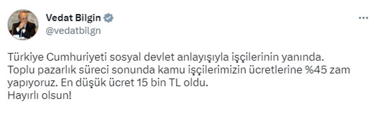 Çalışma ve Sosyal Güvenlik Bakanı Vedat Bilgin, Twitter adresinden paylaştığı mesajla kamu işçilerinin toplu zammını aktardı.