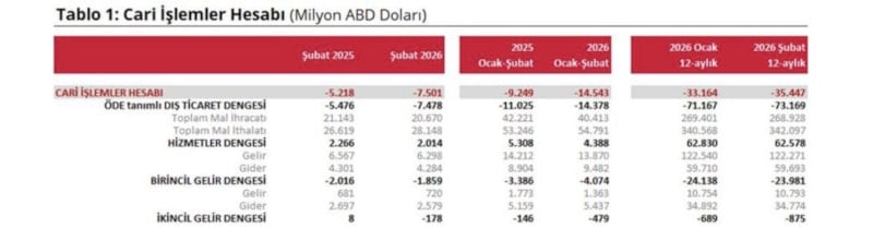 Şubat ayında cari işlemler hesabı 7 milyar 501 milyon ABD doları açık kaydetti. Altın ve enerji hariç cari işlemler hesabı ise 1 milyar 462 milyon ABD doları açık verdi. Ödemeler dengesi tanımlı dış ticaret açığı 7 milyar 478 milyon ABD doları olarak gerçekleşti.