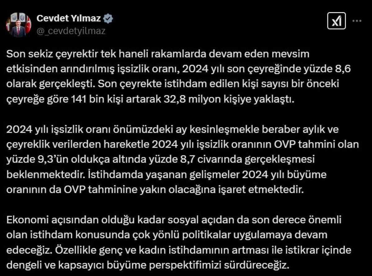 Cevdet Yılmaz, açıklanan Ekim-Aralık 2024 dönemine ilişkin iş gücü istatistikleriyle ilgili sosyal medya hesabından yaptığı değerlendirmede şu ifadelere yer verdi: