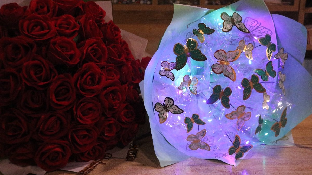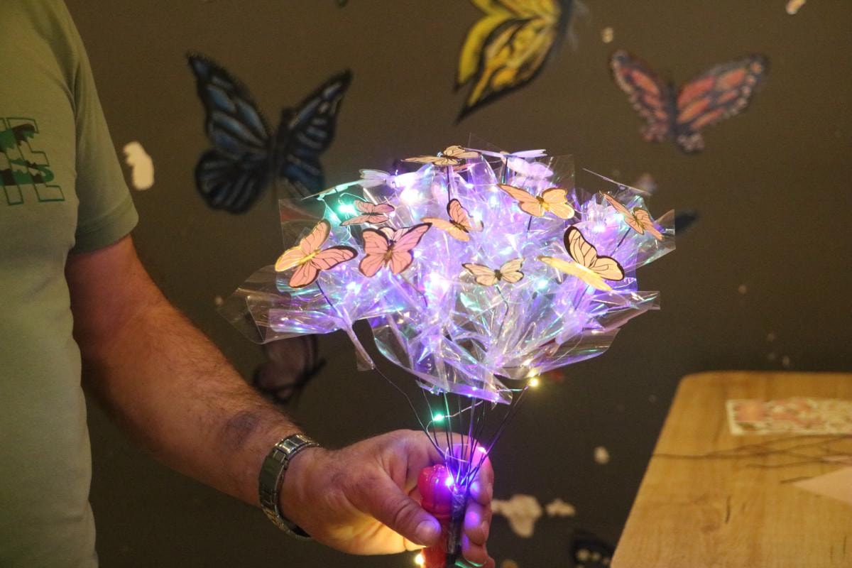 Bu model yeni. Bu sene ışıklı kelebek modelimiz oldukça rağbet görüyor. Bu buketi yapmak yaklaşık 45 dakikamızı alıyor. Bu buketin kendine göre bir zahmeti var. Zaten zahmeti olmasa herkes bunu yapabilir. Geçen senelerde gül, papatya gibi buketler oldukça popülerdi. Şimdi durum biraz daha çeşitli farklı buketlere döndü. Bu furya internet aracılığıyla başladı. Her gören sosyal medyadan bize iletti ve istedi. Biz de bir iki derken sürekli hale getirdik. Günlük en az üç veya dört tane satıyoruz. Standart boyutta yapıyoruz. Fiyatı 500 lira. Daha yeni model çıkana kadar rağbet devam eder. Genelde sevgililer tercih ediyor.
