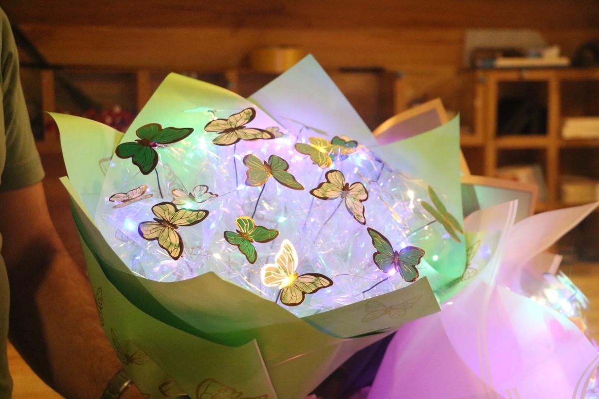 Gelenekselleşen çiçek buketlerinin yerini artık led ışıklı kelebek buketler aldı.
