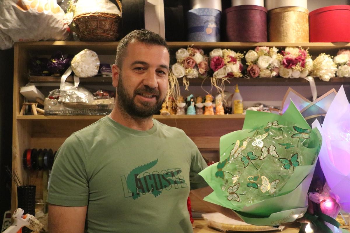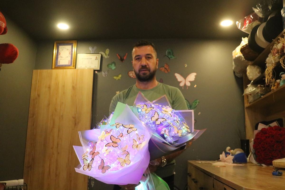 25 yılı aşkındır çiçekçilik yaptığını söyleyen Oğuz Öcal, yeni akımı “Önceden bir dal gül verilirdi şimdi ise ışıklı kelebek buketi veriliyor” diyerek açıkladı.